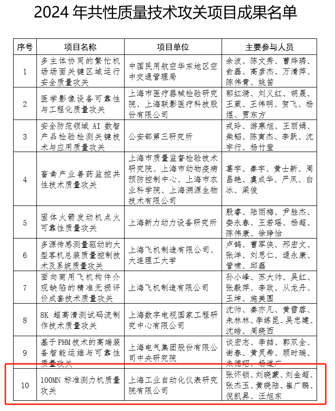 11月7日,上海市市場監(jiān)督管理局、上海市經(jīng)濟(jì)和信息化委員會發(fā)布《關(guān)于表揚(yáng)2024 年上海市產(chǎn)業(yè)質(zhì)量攻關(guān)成果的通知》。上海工業(yè)自動化儀表研究院有限公司(簡稱自儀院)“100MN標(biāo)準(zhǔn)測力機(jī)質(zhì)量攻關(guān)” 項目脫穎而出,獲得2024共性質(zhì)量技術(shù)攻關(guān)項目成果獎。