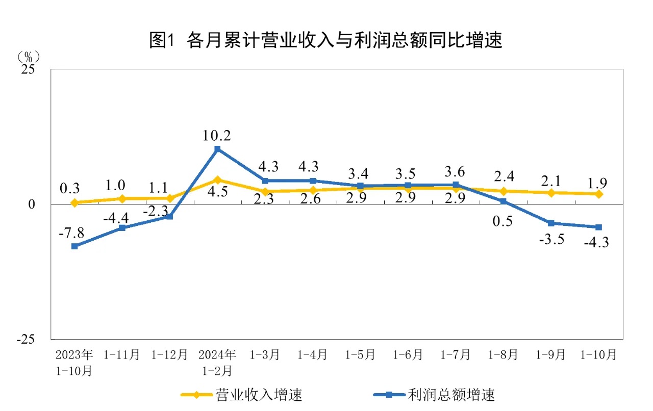 10月份,規(guī)模以上工業(yè)企業(yè)利潤(rùn)同比下降10.0%。