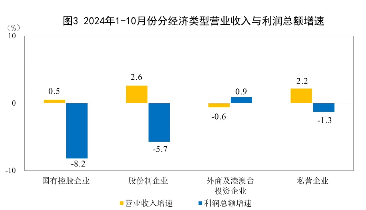 1—10月份,規(guī)模以上工業(yè)企業(yè)中,國(guó)有控股企業(yè)實(shí)現(xiàn)利潤(rùn)總額18530.9億元,同比下降8.2%;股份制企業(yè)實(shí)現(xiàn)利潤(rùn)總額43718.5億元,下降5.7%;外商及港澳臺(tái)投資企業(yè)實(shí)現(xiàn)利潤(rùn)總額14559.0億元,增長(zhǎng)0.9%;私營(yíng)企業(yè)實(shí)現(xiàn)利潤(rùn)總額16501.7億元,下降1.3%。