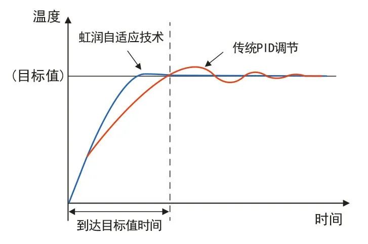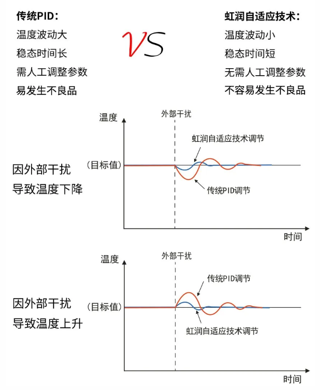 虹潤(rùn)自適應(yīng)控制技術(shù)可自動(dòng)整定出較佳PID值。監(jiān)視裝備的溫度控制狀態(tài),自動(dòng)調(diào)節(jié)PID值,對(duì)工件變化及裝備變化、環(huán)境變化等進(jìn)行較佳溫度控制。