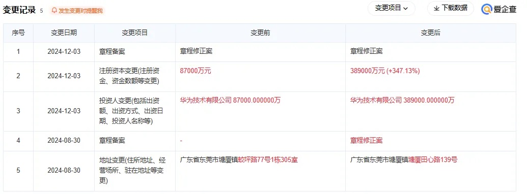12月3日,華為對其全資持股的機器人企業(yè)——東莞極目機器有限公司,增資30余億元,注冊資本從8.7億人民幣增至38.9億人民幣,增幅約347%。