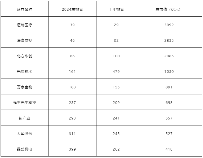 2024年股市圓滿收官,中國上市公司市值500強榜單隨之揭曉。數據顯示,2024年市值500強企業平均市值、中位數市值和最低市值分別為1483億元、651億元和344億元,較2023年分別增長241億元、60億元和36億元。 經小編統計,多家儀器企業登榜,涵蓋邁瑞醫療(生命科學儀器領域)、??低暎ü鈱W儀器領域)及北方華創(半導體設備供應商)等,展現了其在各自專業領域的卓越成就。