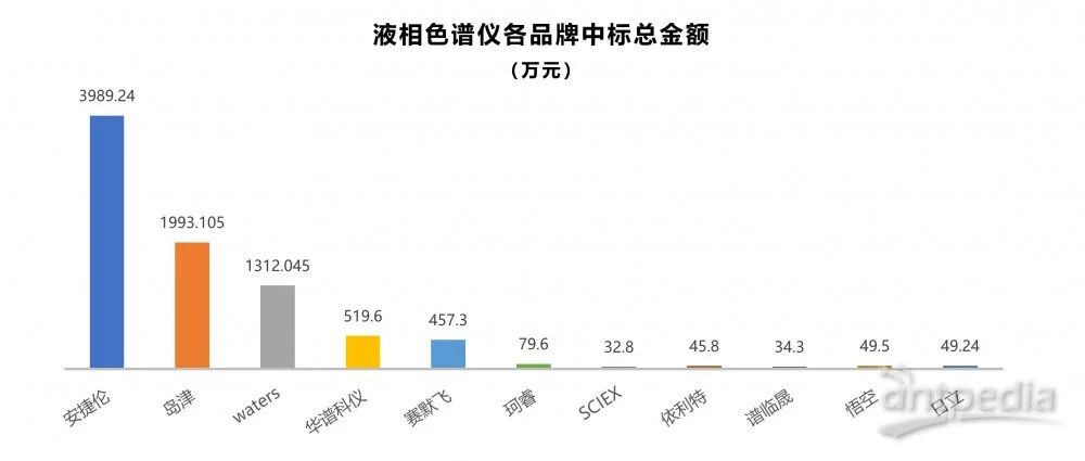 從總金額來看,安捷倫以3989.24萬元位居首位,占整體中標金額的47.6%;島津(1993.105萬元)、Waters1312.045萬元)、華譜科儀(519.6萬元)和賽默飛(457.3萬元)分列二至五位。值得一提的是華譜科儀,其以中標總金額519.6萬元排名第四,在本次海關設備更新的液相色譜招標中,堪稱一匹黑馬。