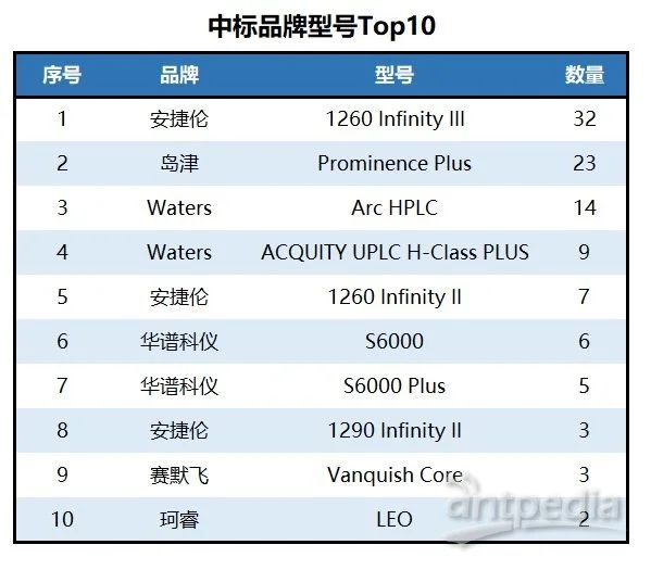 根據此次中標結果,分析測試百科網梳理出品牌熱門型號 Top10。從中標型號分布來看,安捷倫憑借1260系列(含Infinity IIIInfinity II)全面領跑市場,其中1260 Infinity III32臺(套)的絕對優勢獨占鰲頭,憑借高精度、高穩定性和廣泛的應用場景,贏得了海關單位的青睞。島津Prominence Plus系列和WatersArc HPLCACQUITY UPLC H-Class PLUS分別位列二、三、四位。國內品牌中,華譜科儀的S6000S6000 Plus與珂睿的LEO成為唯二上榜的國產代表型號。整體而言,國際品牌的多種型號依舊主導市場,國產設備在技術適配性和應用場景拓展方面,仍有較大的提升空間。