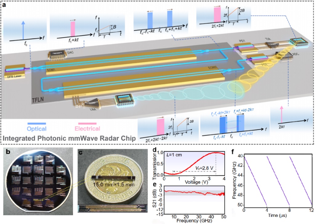 近日,中國科學院院士、南開大學智能光子研究院院長祝寧華團隊與香港城市大學合作,成功研制出薄膜鈮酸鋰光子毫米波雷達芯片,在毫米波雷達領域取得重大突破。這一創新成果,為未來6G通信、智能駕駛、精準感知等前沿領域的應用奠定了堅實基礎。