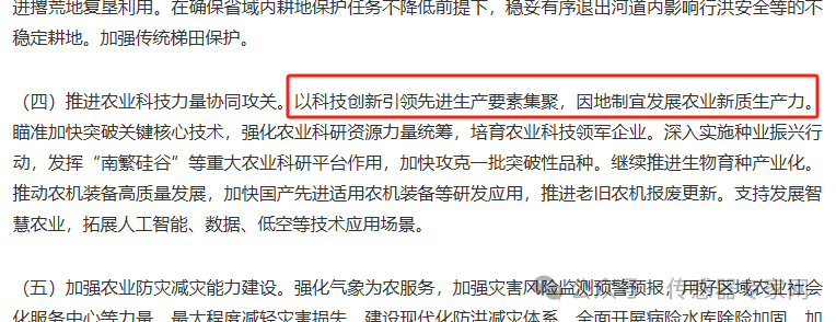 尤其值得關注的是,本次中央一號文件首次提出農業新質生產力概念,明確要推進農業科技力量協同攻關:
