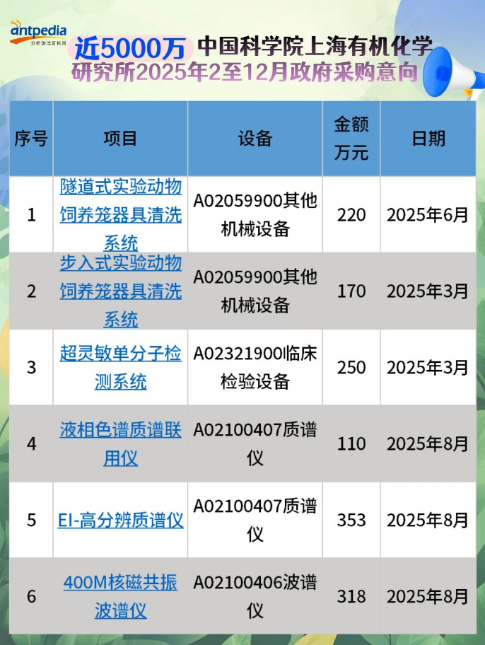中國科學院上海有機化學研究所2025年2至12月政府采購意向發布,預算金額4895萬,采購項目13個。