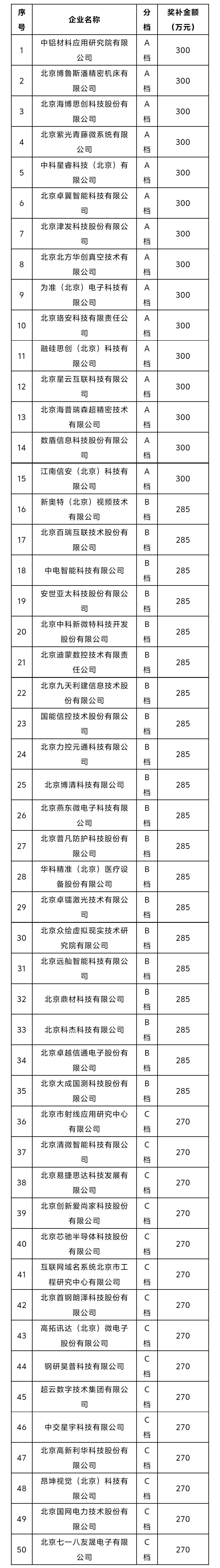 新一輪第一批重點小巨人企業高質量發展項目期初獎補資金擬對中鋁材料應用研究院有限公司等15A檔企業、新奧特(北京)視頻技術有限公司等20B檔企業、北京市射線應用研究中心有限公司等15C檔企業進行獎補,詳情見附件。