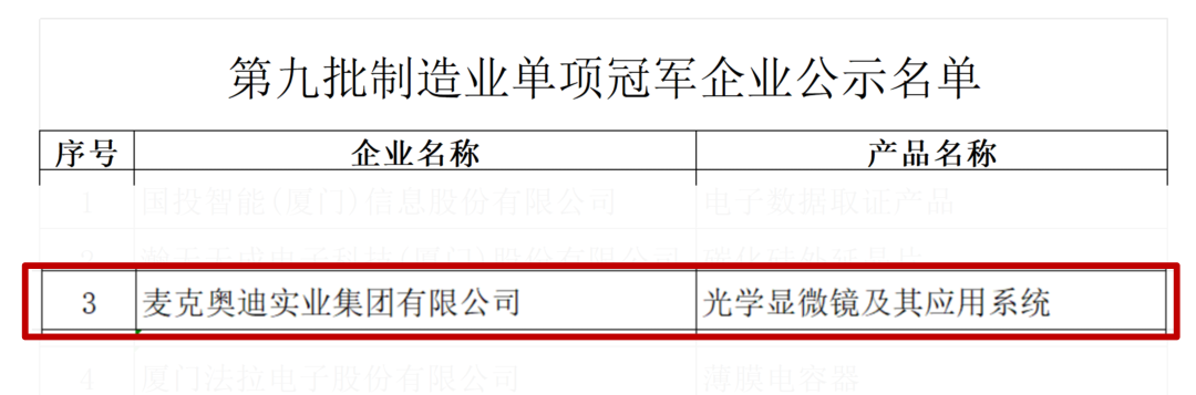 制造業(yè)單項冠軍企業(yè),是指長期專注于制造業(yè)特定細(xì)分領(lǐng)域,生產(chǎn)技術(shù)或工藝水平國際先進(jìn),單項產(chǎn)品(生產(chǎn)性服務(wù))市場占有率位居全球前列的企業(yè)。該獎項是工信部為推動制造業(yè)高質(zhì)量發(fā)展而開展的培育提升專項行動的重要組成部分,代表了我國制造業(yè)向中高端邁進(jìn)的方向。此次麥克奧迪光學(xué)“顯微鏡及其應(yīng)用系統(tǒng)”產(chǎn)品的成功獲評,既是對我司在該領(lǐng)域的技術(shù)積淀、市場份額、品質(zhì)把控等方面的高度認(rèn)可,更是對“創(chuàng)新智造,引領(lǐng)顯微科技”理念的最佳詮釋。