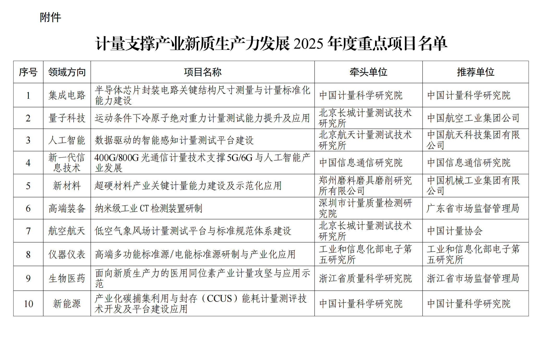 附件:計量支撐產(chǎn)業(yè)新質(zhì)生產(chǎn)力發(fā)展2025年度重點項目名單