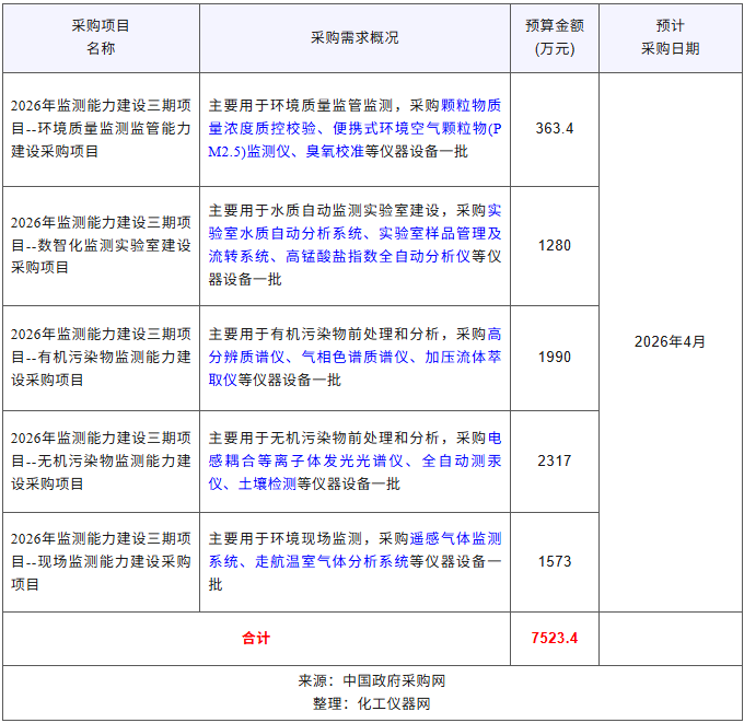近期,江西省生態環境監測中心發布“江西省生態環境監測中心2026年度政府采購意向公告(2)”,計劃采購便攜式環境空氣顆粒物(PM2.5)監測儀、實驗室水質自動分析系統、高分辨質譜儀、氣相色譜質譜儀、加壓流體萃取儀、電感耦合等離子體發光光譜儀、全自動測汞儀等大批環境監測設備,預算總金額7523.4萬元。預計采購時間20264月。