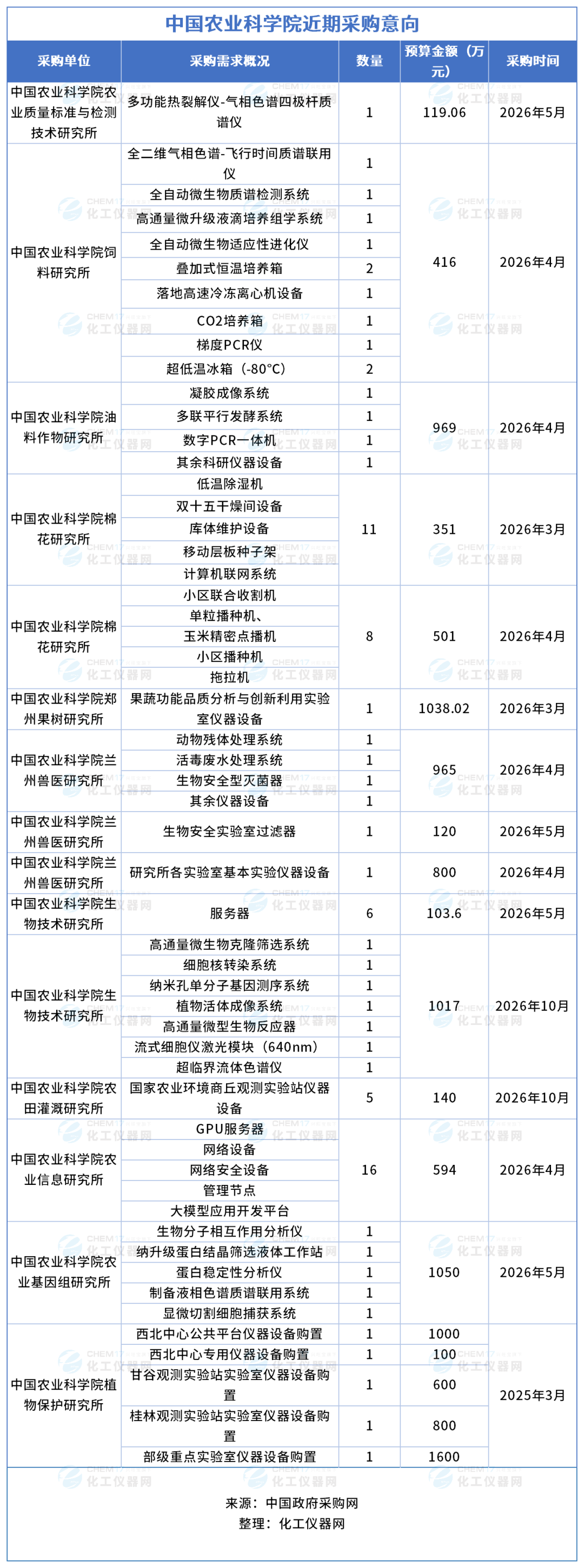 近期,中國農業科學院各院所發布多項儀器采購意向,采購預算金額12283.68萬元,涉及儀器設備包括多功能熱裂解儀-氣相色譜四極桿質譜儀、全二維氣相色譜-飛行時間質譜聯用儀、全自動微生物質譜檢測系統、高通量微升級液滴培養組學系統、全自動微生物適應性進化儀、疊加式恒溫培養箱、落地高速冷凍離心機設備等。預計采購時間20263-10月。